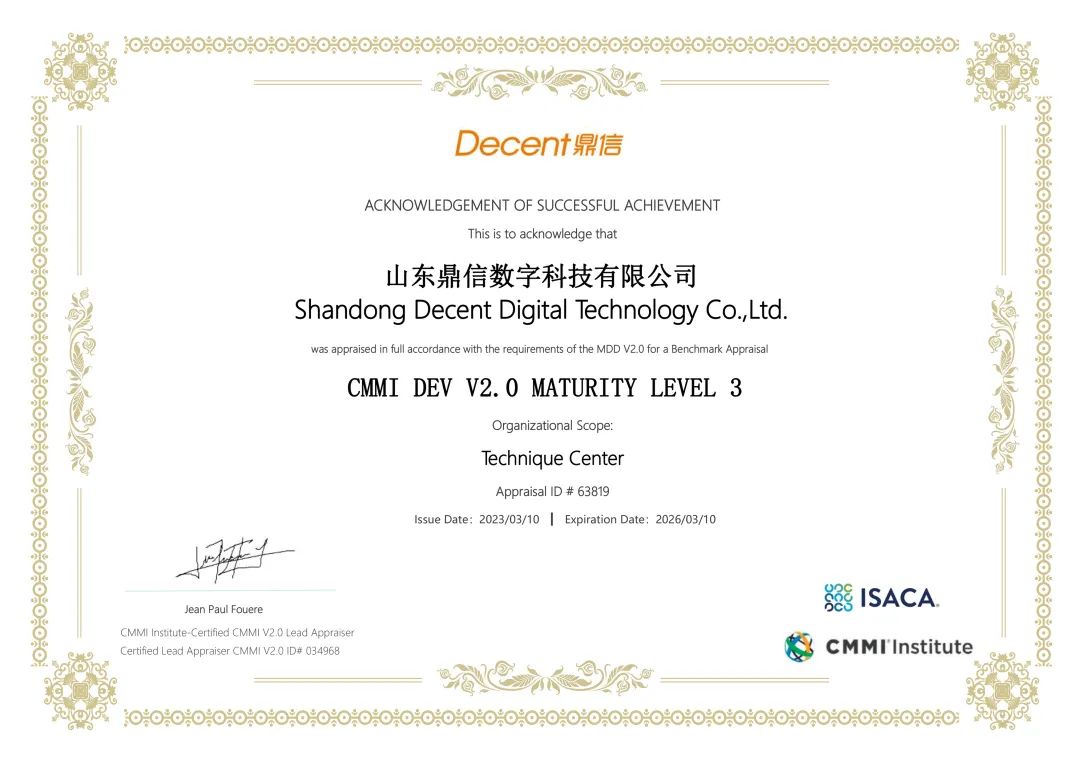 近日,经过CMMI研究院严格的资质审查与现场评估,山东鼎信数字科技有限公司正式通过CMMI软件能力成熟度国际三级评估认证。这标志着鼎信数字在技术研发标准化流程、过程管理能力、项目管理能力等方面已跻身业界先进水平。CMMI三级认证这一关键节点的打通,将为鼎信数字持续提升数字化营运和支撑能力,赋能服务客户,持续提供强劲动力。